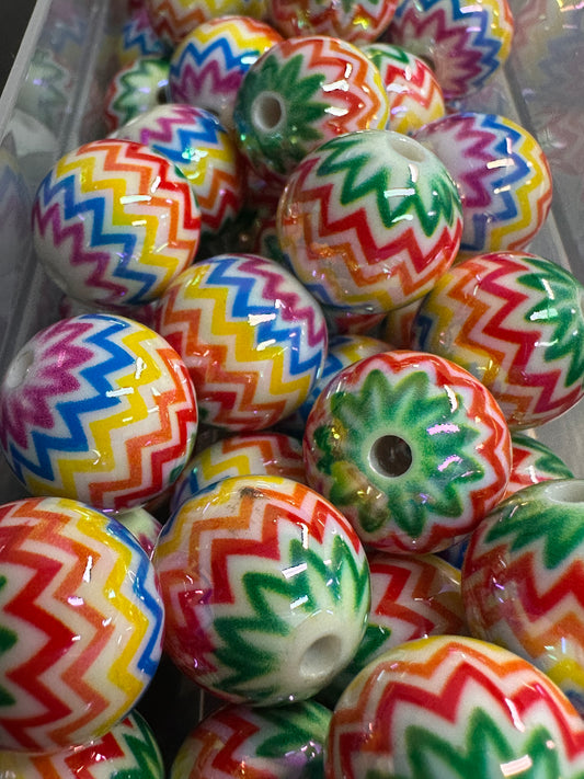 Multicolored zig zag stripes on white jelly beads/ Ten (10) acrylic multicolored round shaped beads included/ jewelry Bead/ beadable pen beads/ keychain bead/ DIY/ shiny unique 16mm beads UV coated/
