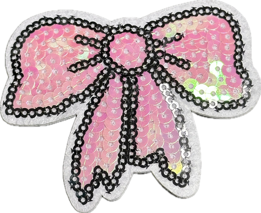 PINK BOW/IRON ON PATCH/ SIZE APPROXIMATELY 2.5 x 3.5/ SEQUIN MATERIAL/FABRIC PATCHES