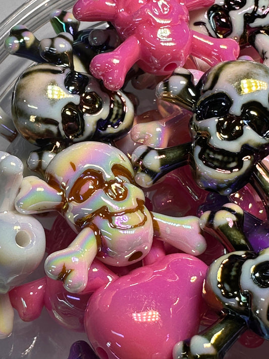 Six (6) acrylic assorted color skull and crossbones beads included/ jewelry Bead/ beadable pen beads/ keychain bead/