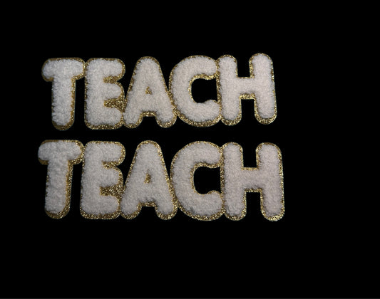 TEACH/ WHITE AND GOLD PATCH MEDIUM APPROX. 2x7 -WHITE CHENILLE AND GOLD GLITTER/ TEACHER