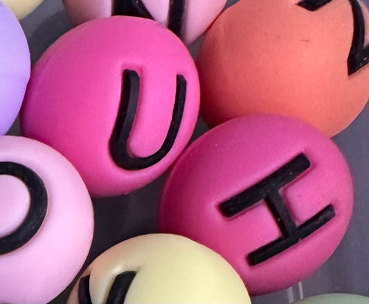 Multi color alphabet letter set silicone round beads/ 26 beads included/15 mm/ pen/ keychain beads/ hole top to bottom/ hard to find beadperfect for beadable pens and keychain DIY/