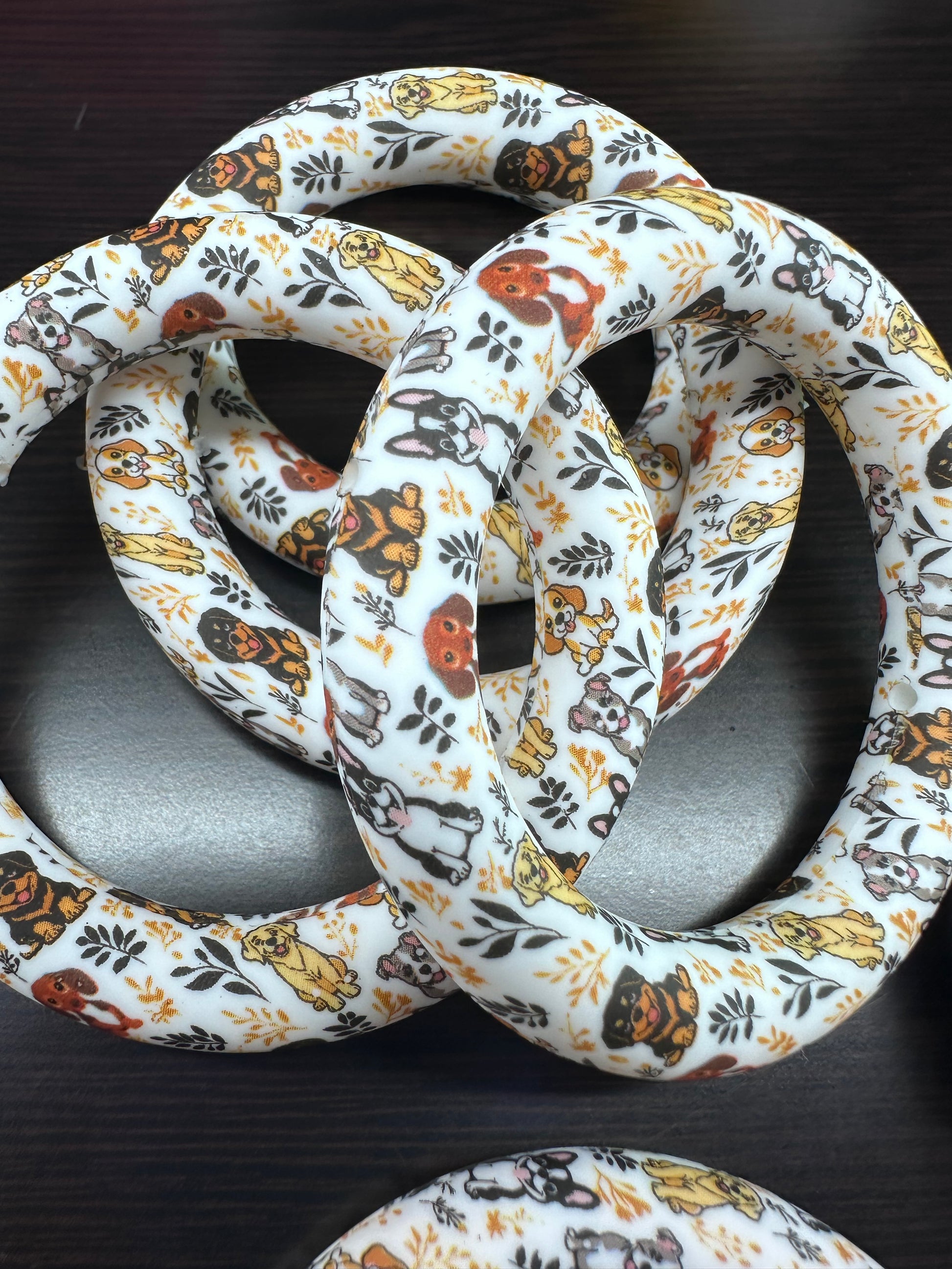 9. Printed Dog round circle â Paw & Dog Pattern Classic bow shaped silicone bead featuring an all-over paw print and dog design.