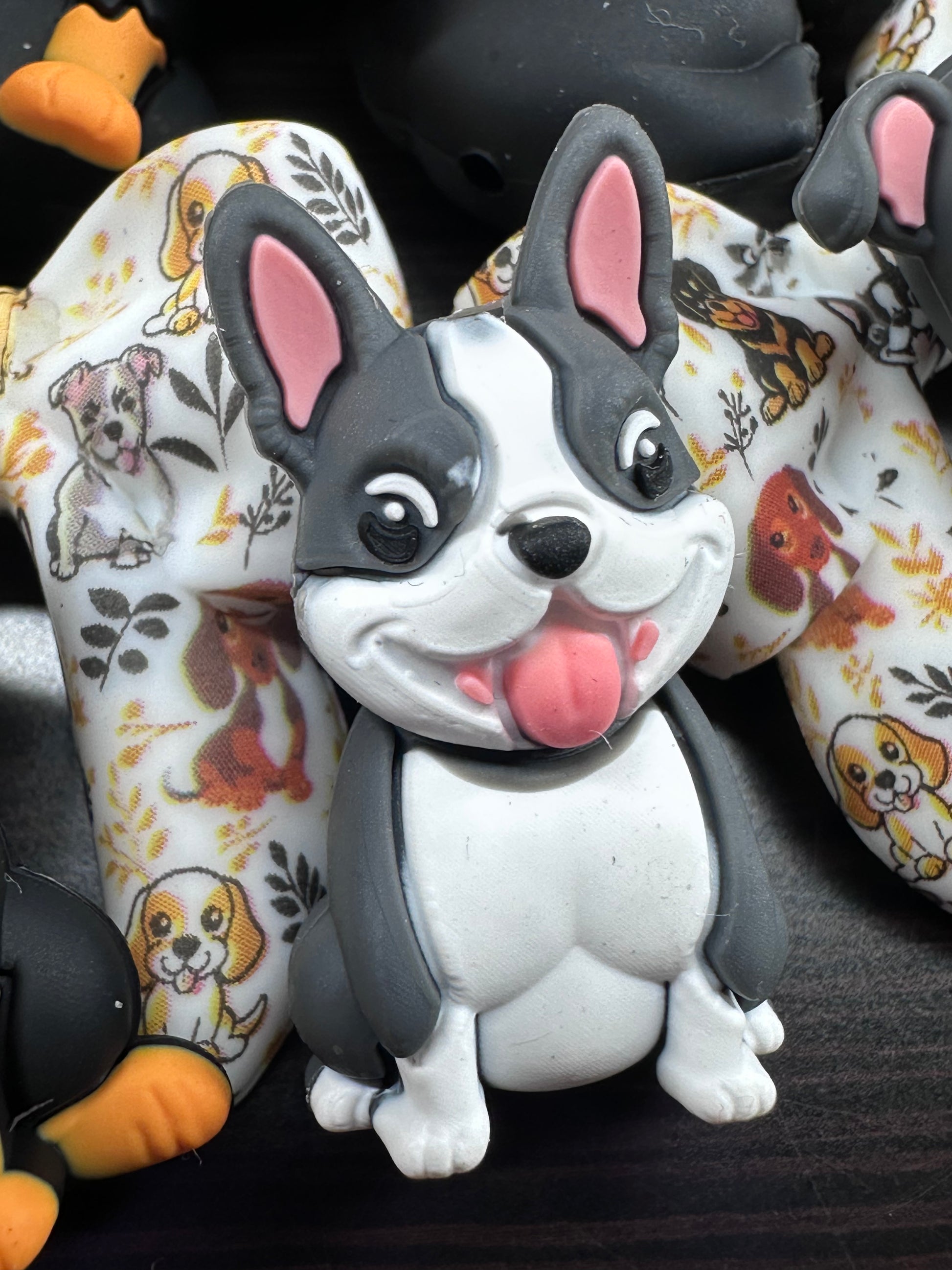 4. French Bulldog Dog Bead (Gray & White)Â Chunky French Bulldogâstyle dog bead with upright ears and a playful expression.