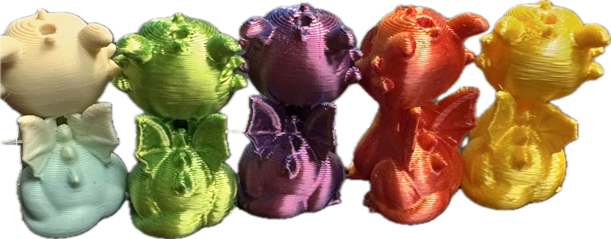 The texture shows smooth layered lines, often seen in hand-crafted or 3D-printed resin or acrylic pieces, which adds to their charm. The colors range from fiery orange to rich purple and emerald green, each catching light beautifully.