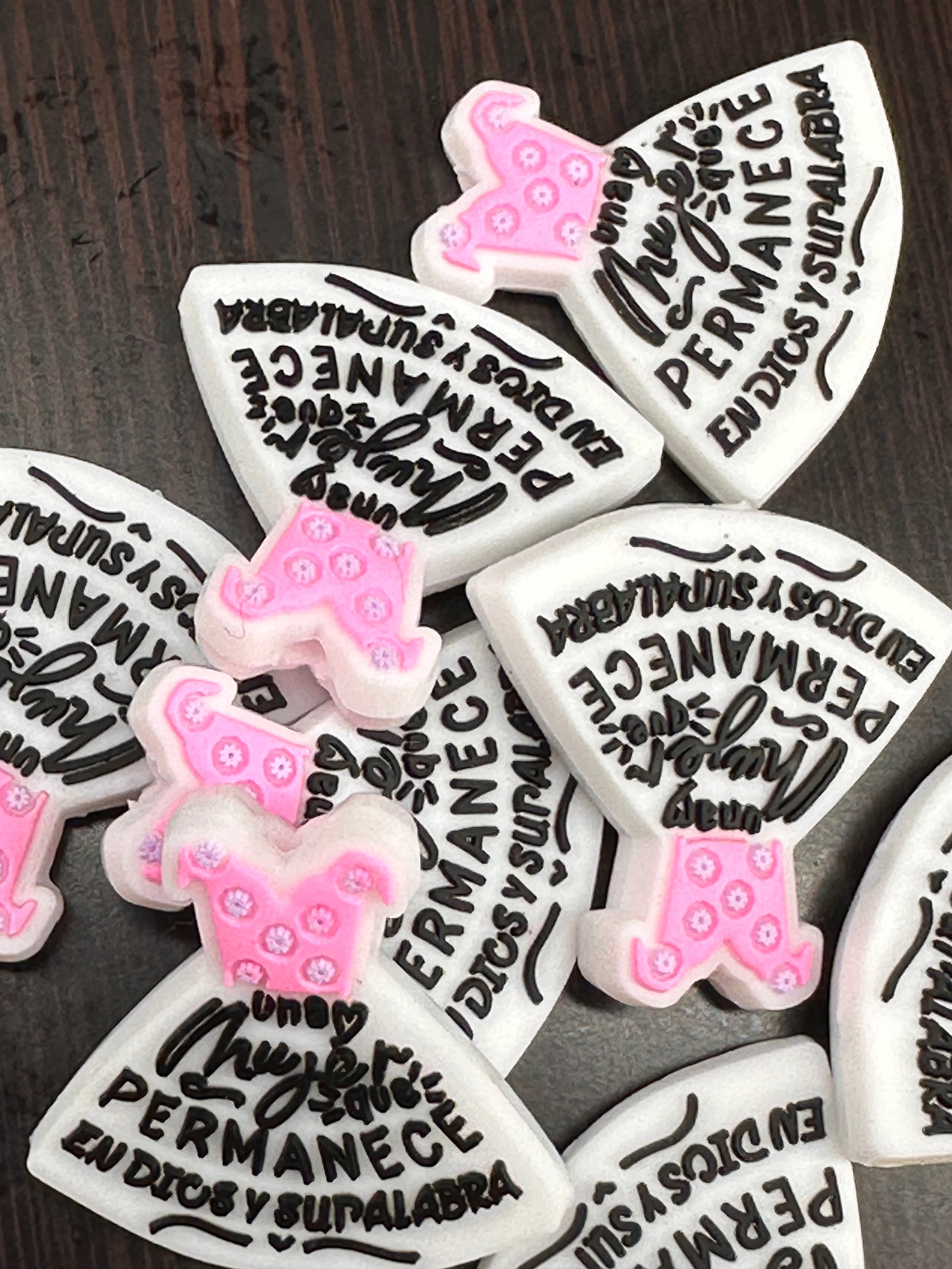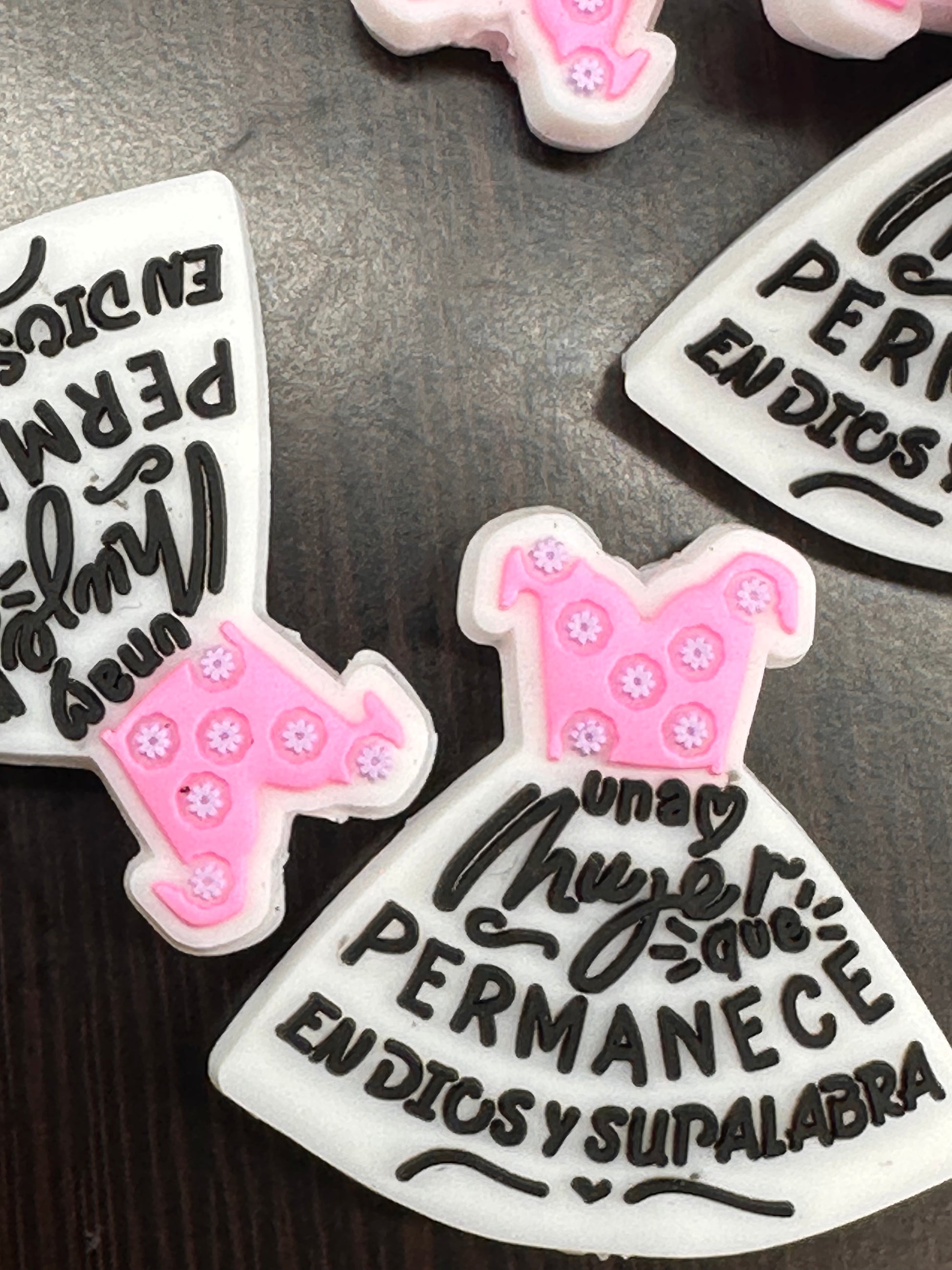 This beautiful dress-shaped silicone focal bead features an inspiring Spanish message that reads “Una mujer que permanece en Dios y su palabra” — meaning “A woman who remains in God and His word.” The top of the dress is detailed in soft pink with floral accents, and the white skirt showcases raised black lettering for a bold, elegant look.