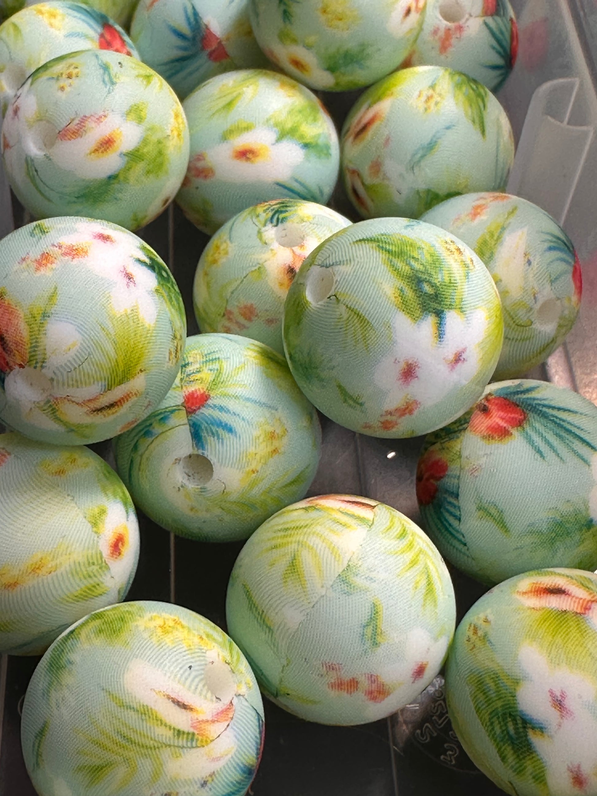 These round silicone beads feature a soft mint green background with a tropical floral pattern in vibrant shades of red, yellow, and green. Perfect for summer-inspired creations, they bring a bright, breezy vibe to beadable pens, keychains, bracelets, and other DIY crafts. Smooth, lightweight, and durable, they’re a must-have for fun, tropical-themed projects.