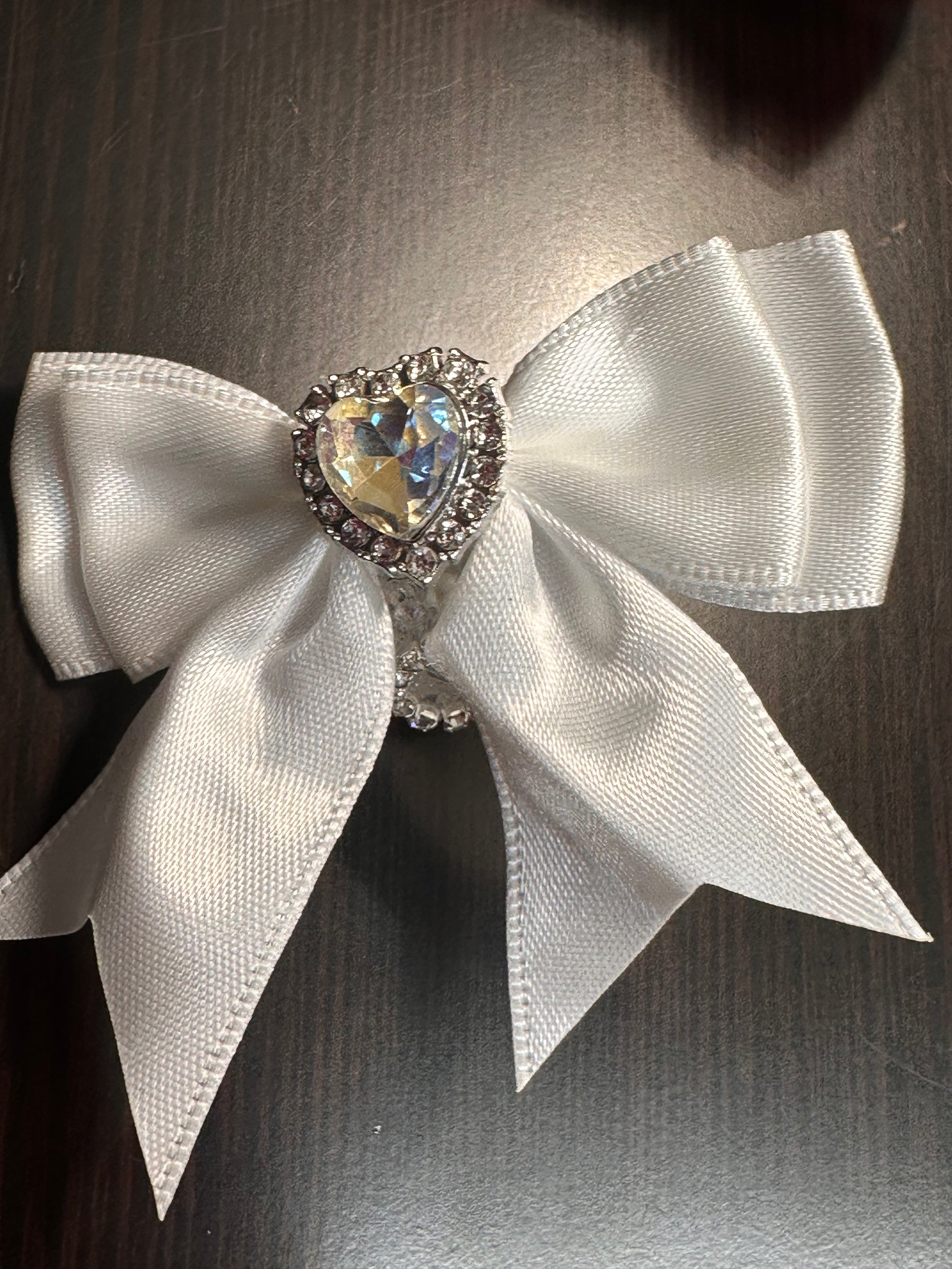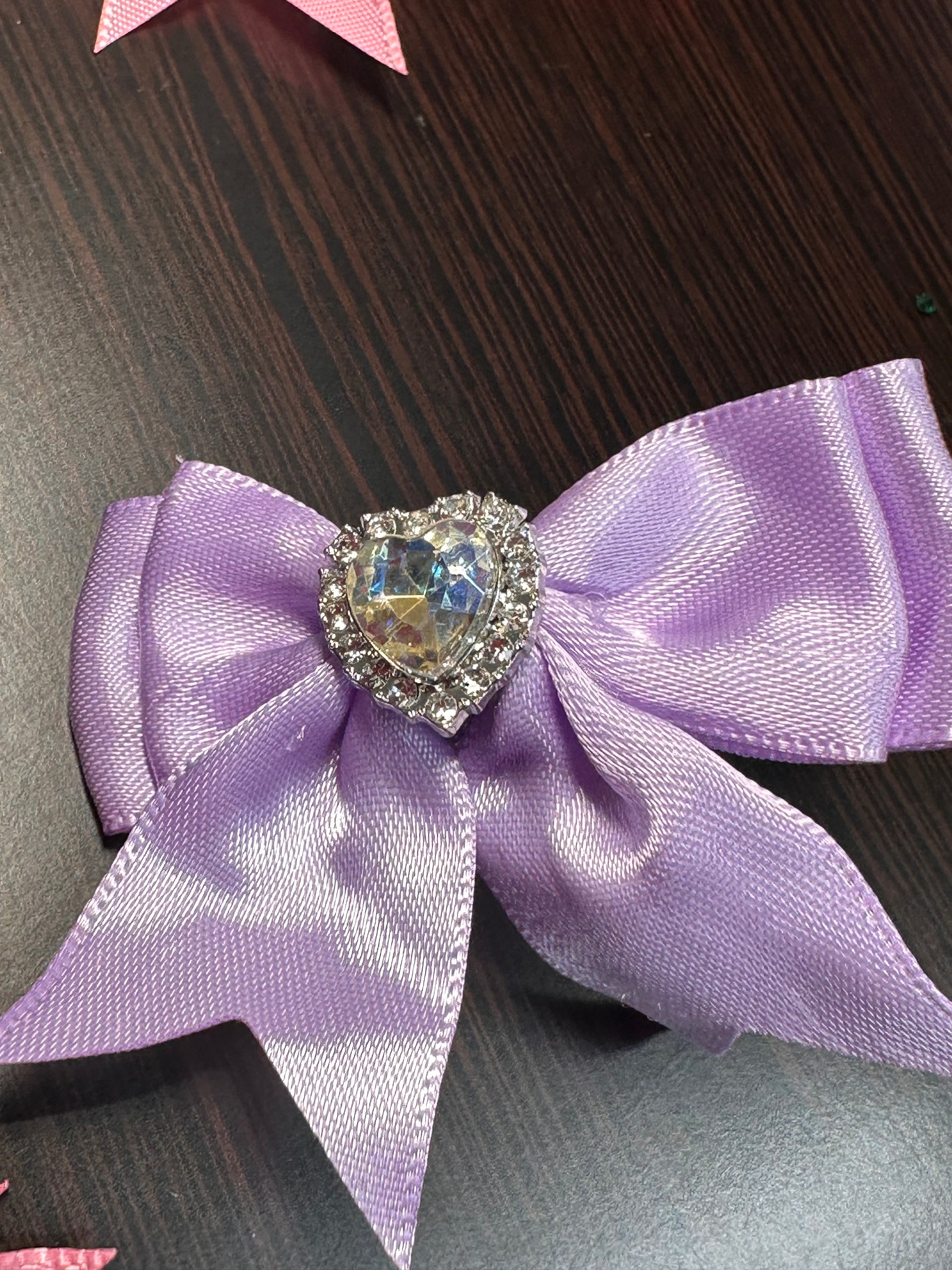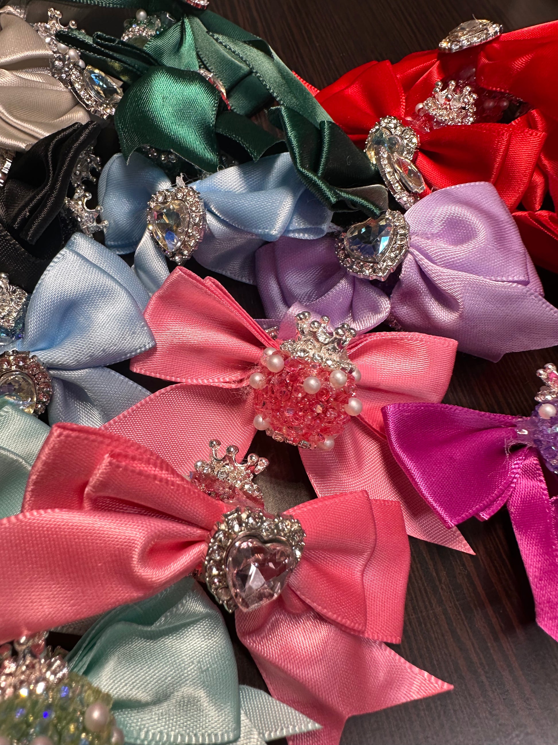 - Each bow is unique with heart-shaped rhinestones or pearl-beaded crown centers